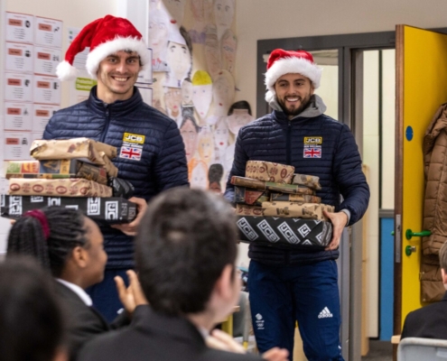 Christmas joy for children: Staffordshire Olympians Adam Burgess and Ben Williams played Santa to local children by delivering gifts donated to the JCB…